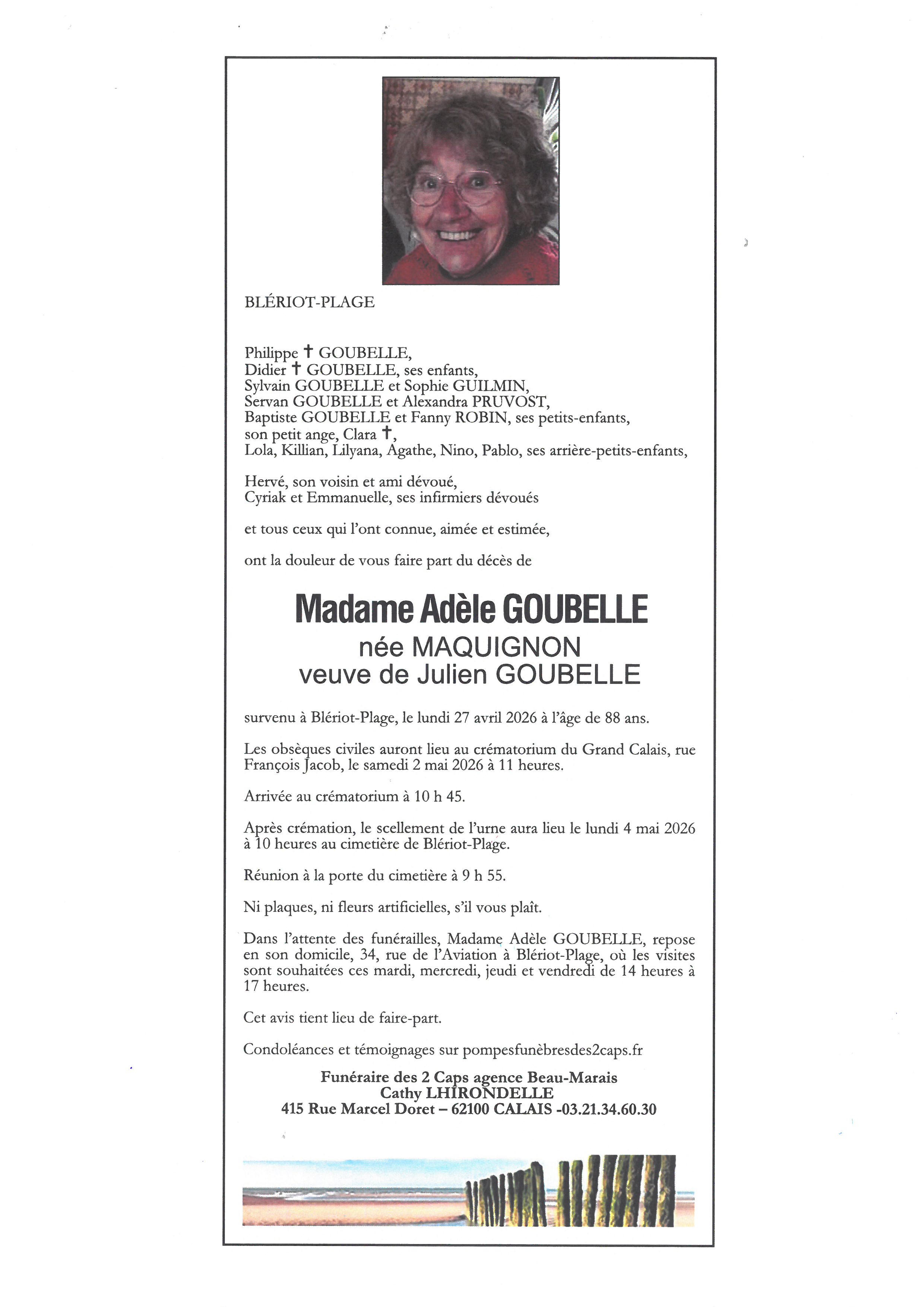 Avis de décès de Madame Adèle GOUBELLE née MAQUIGNON