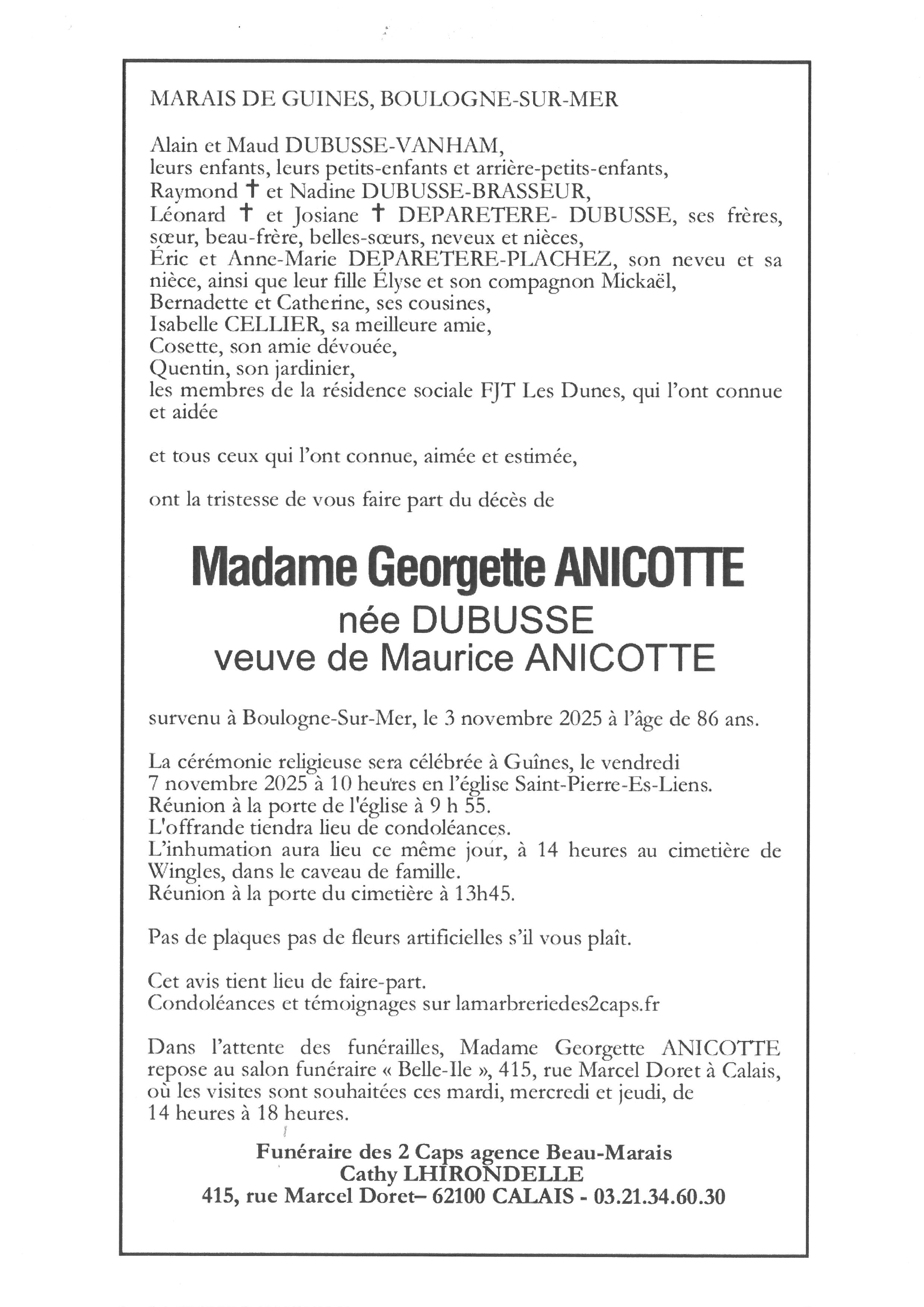 Déroulement des funérailles de Madame Georgette ANICOTTE