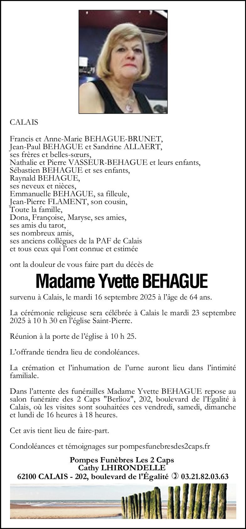 Avis de décès de Madame Yvette BEHAGUE