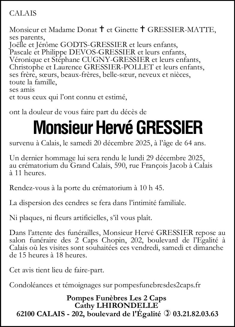 Avis de décès de Monsieur Hervé GRESSIER