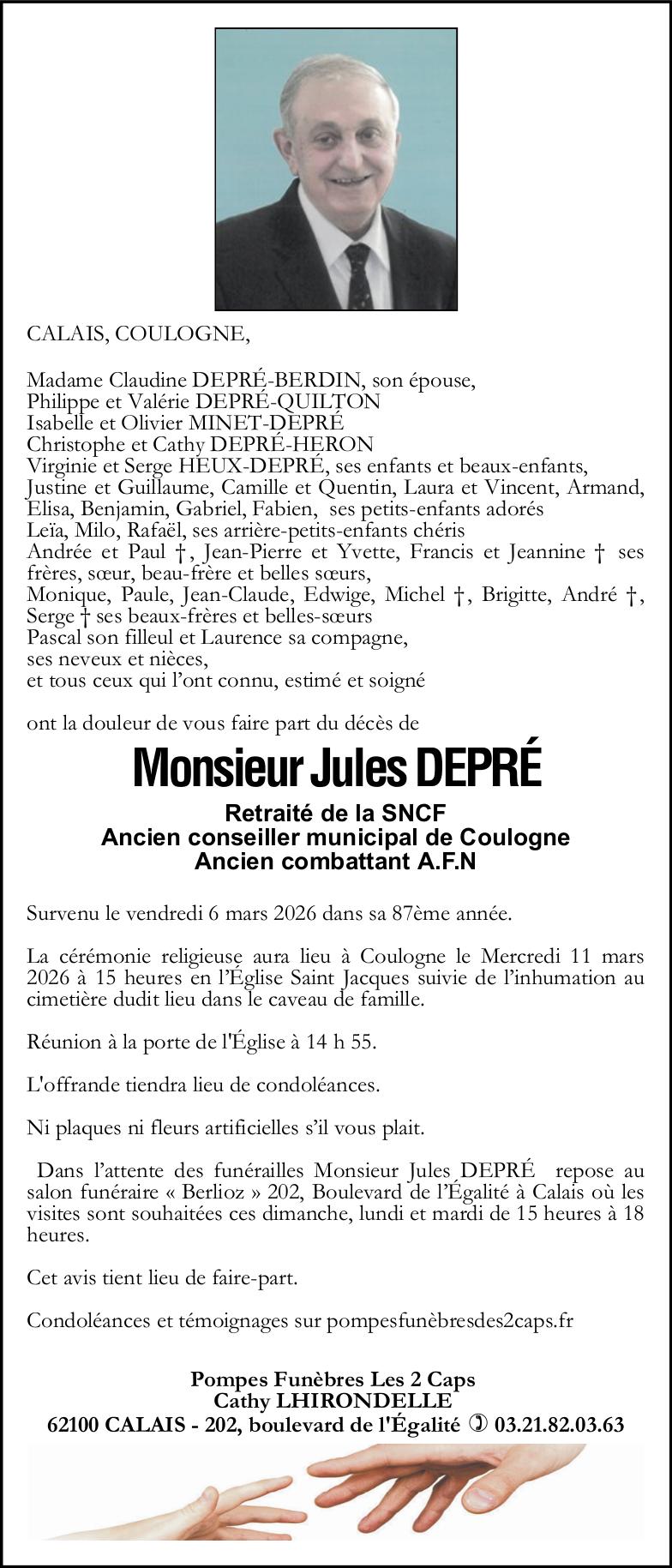 Avis de décès de Monsieur Jules DEPRÉ