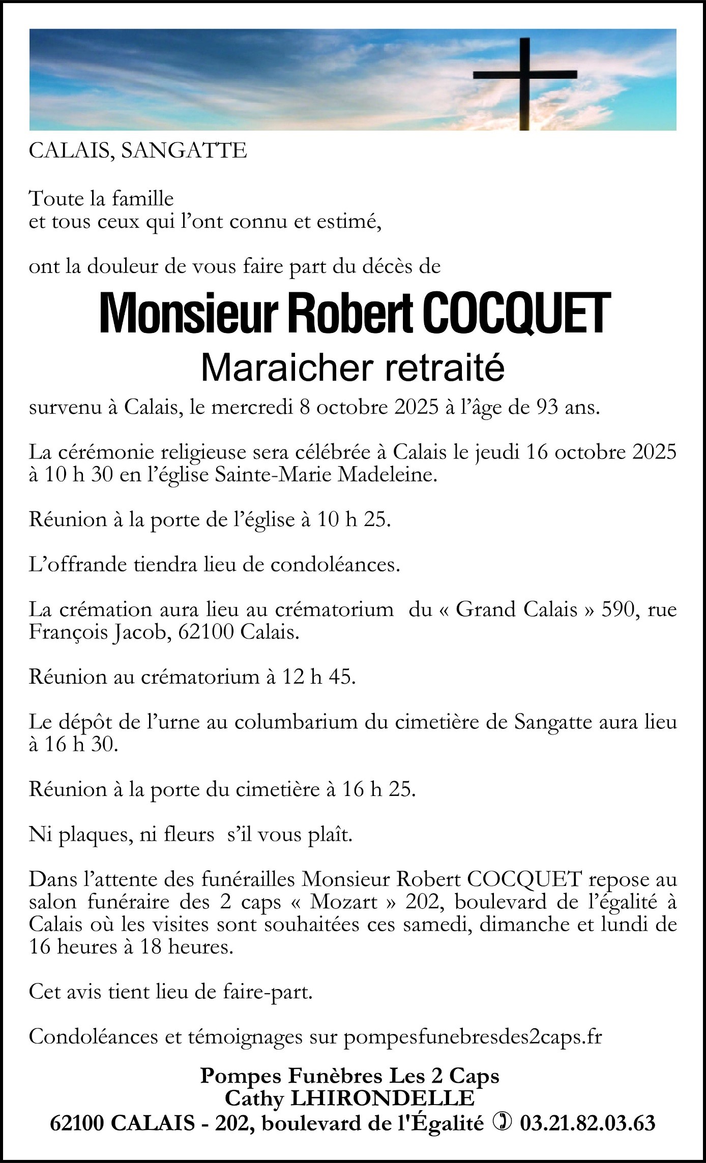 Déroulement des funérailles de Monsieur Robert COCQUET